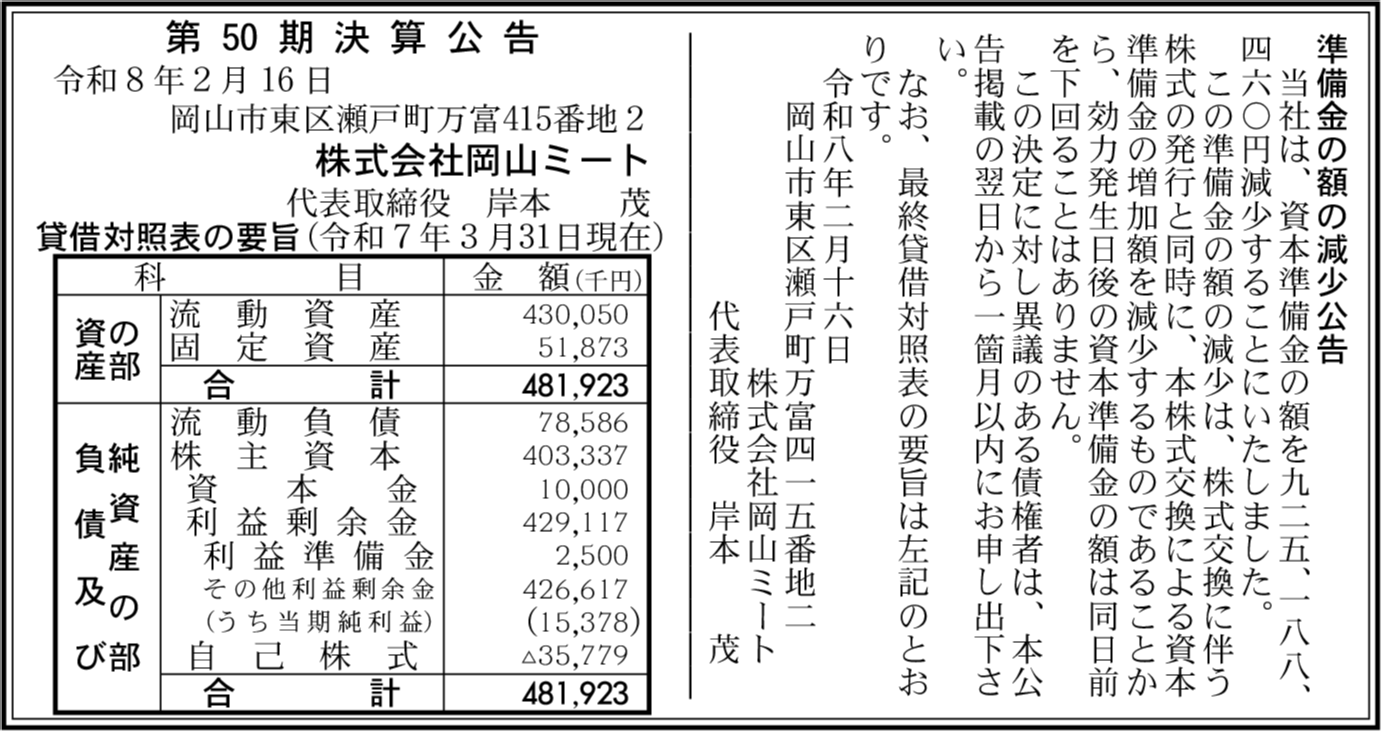 | 会社名 | 株式会社岡山ミート |