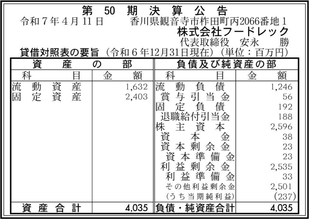 四国フクスケ株式会社 香川県観音寺市 【2025年3月期】 |