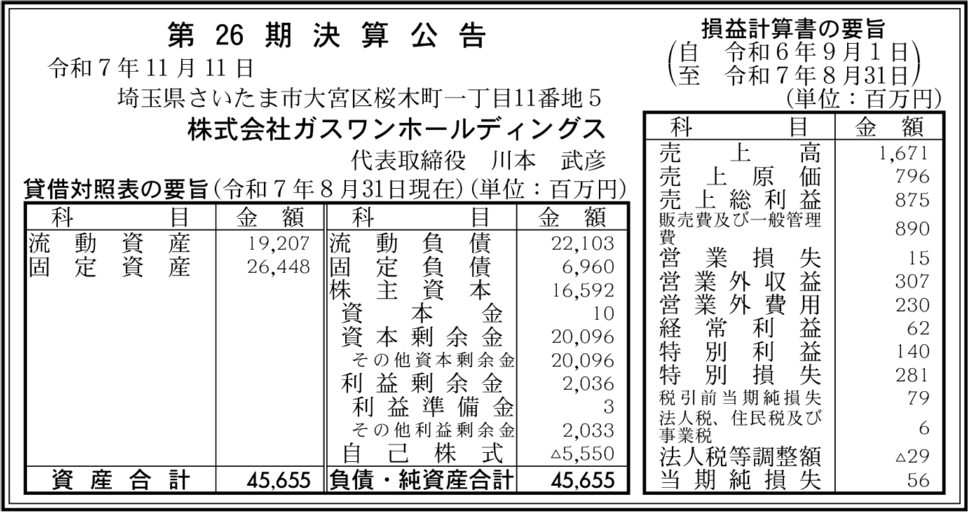 株式会社ガスワン埼玉 埼玉県さいたま市大宮区 【2024年8月期】 |