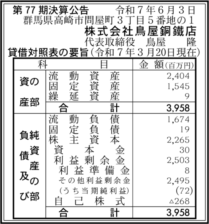 | 会社名 | 株式会社鳥屋銅鐡店 |