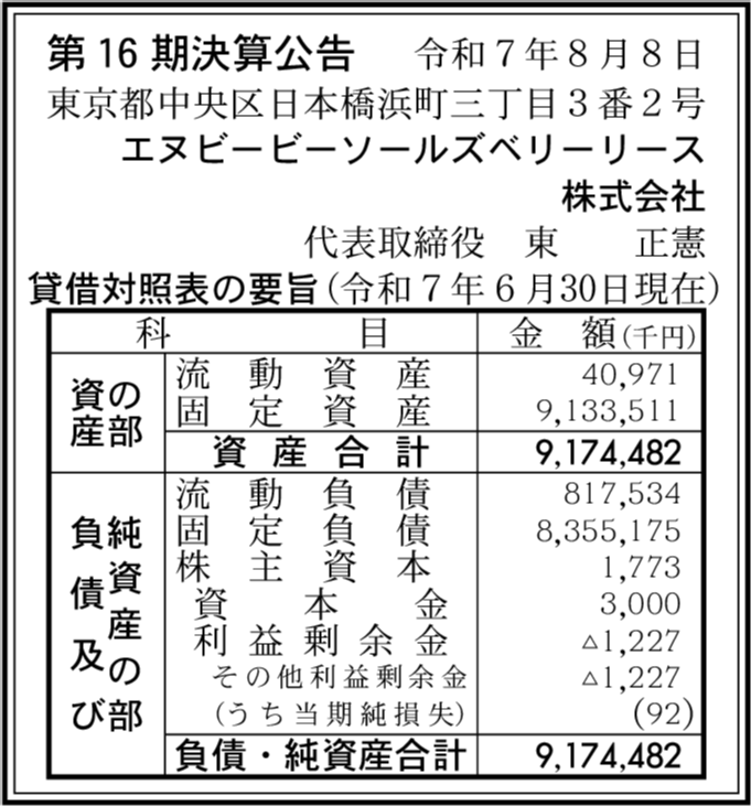 エヌビービーブリストルリース株式会社 東京都中央区 【2025年6月期】 |