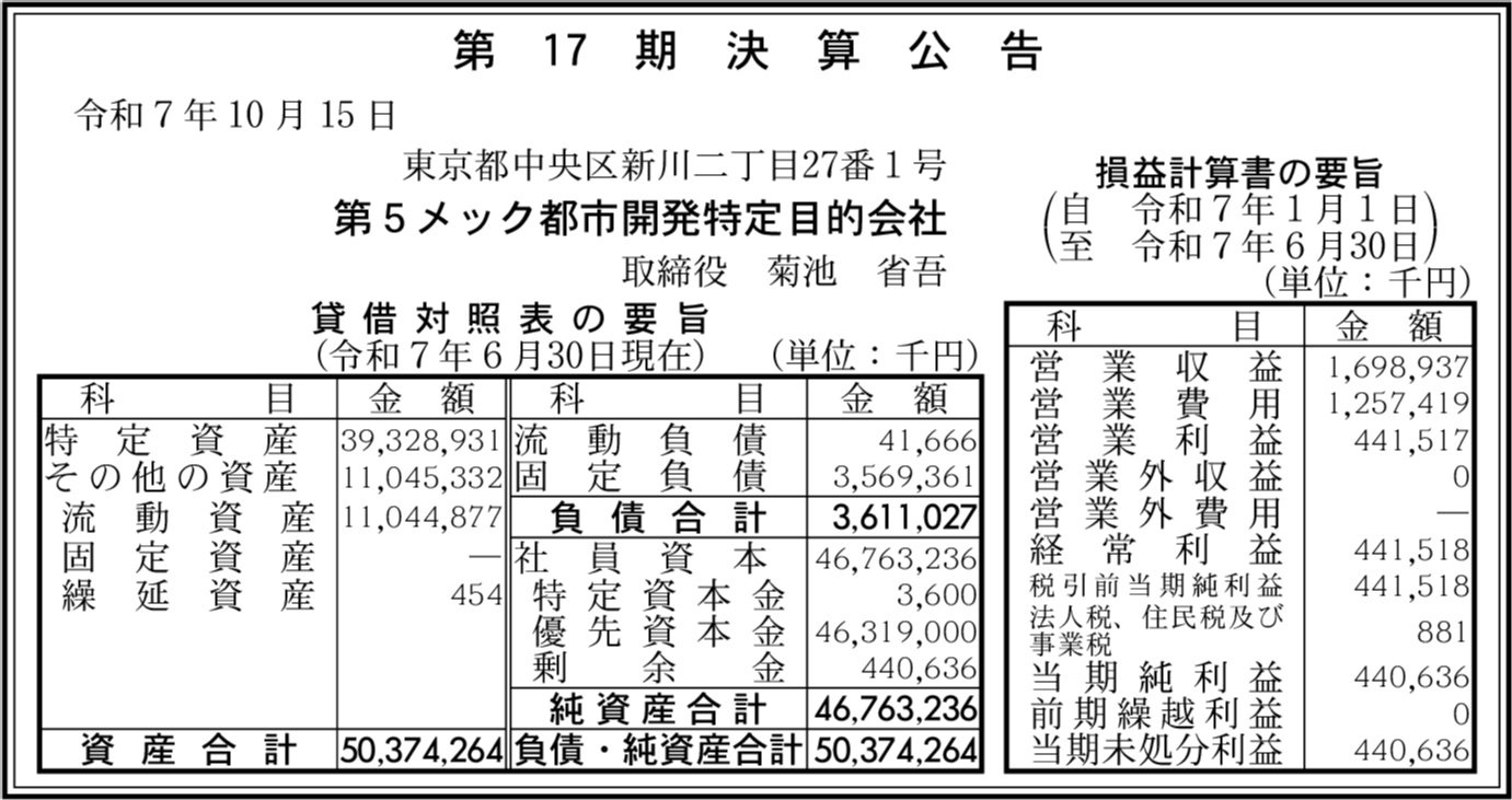 会社名 | 第5メック都市開発特定目的会社 |