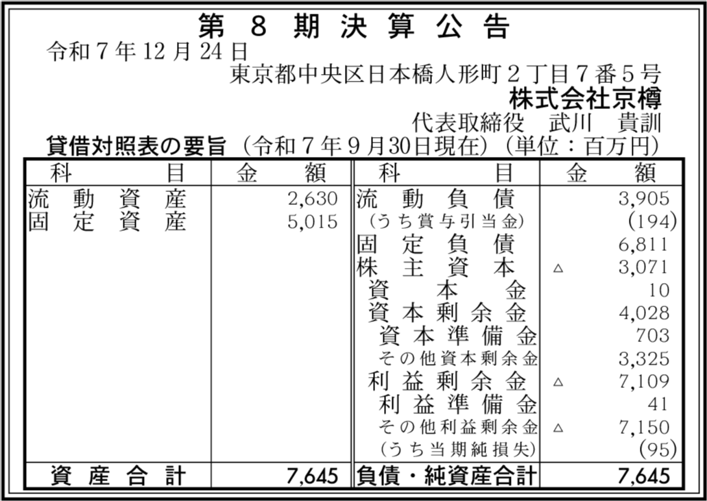 | 総資産 | 76億4,500万円 (▲8.59%) |