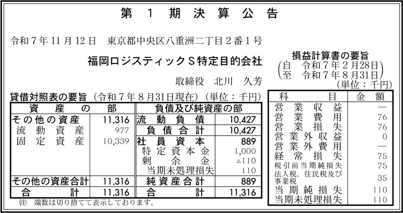 福岡ロジスティックE特定目的会社 東京都中央区 【2025年8月期】 |