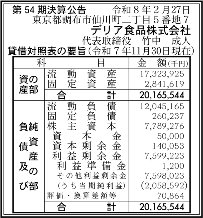 | 株式会社旬菜デリ | 東京都昭島市 | 5億9,953万9,000円 (▲20.65%) |