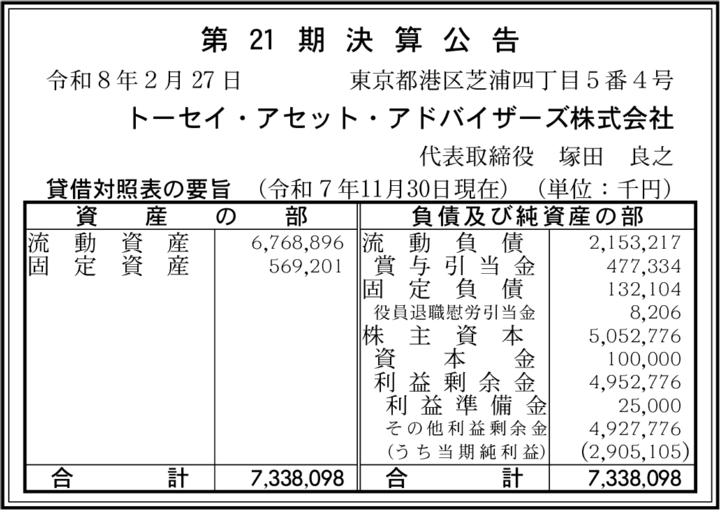 | 会社名 | トーセイ・アセット・アドバイザーズ株式会社 |