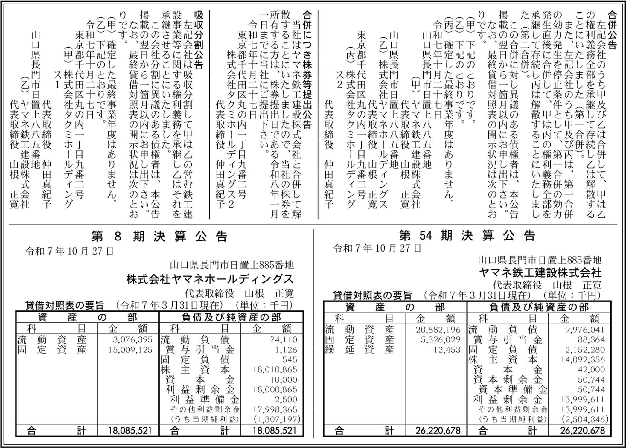 ヤマネ鉄工建設株式会社 山口県長門市 【2025年3月期】 |