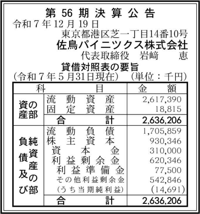 | 会社名 | 佐鳥パイニツクス株式会社 |