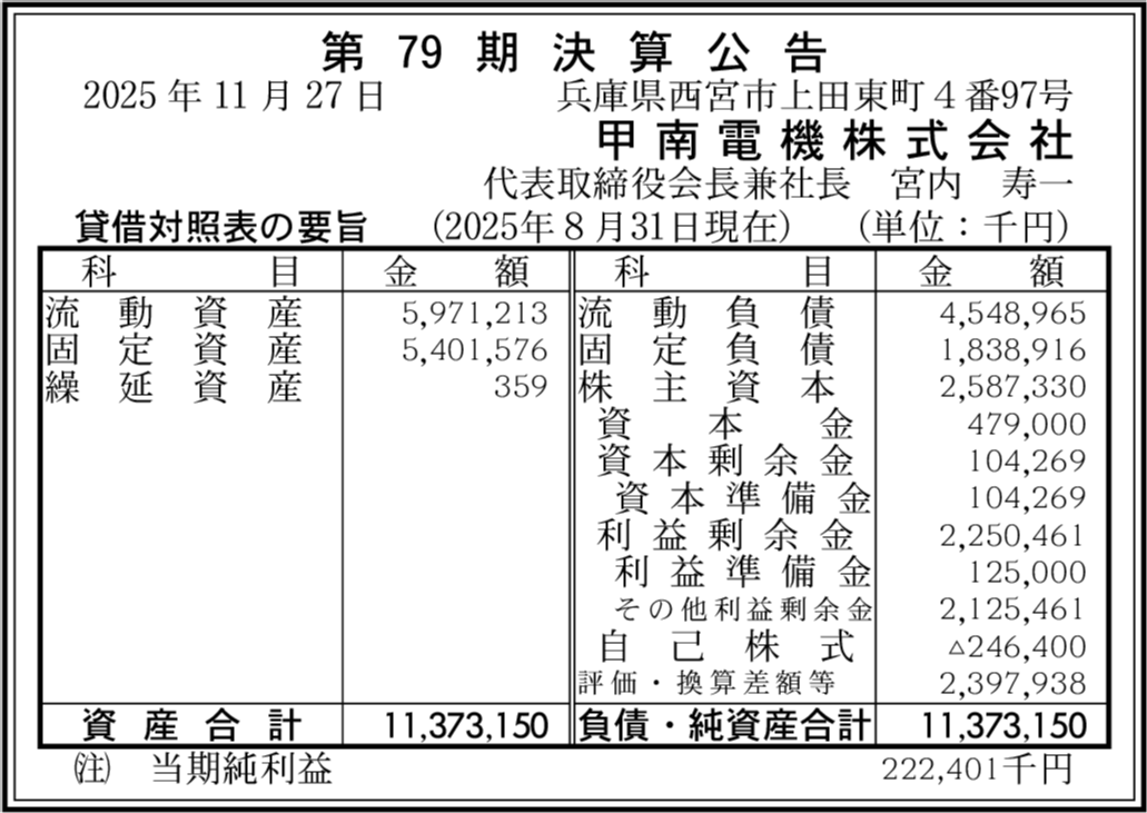 | 利益剰余金 | 22億5,046万1,000円 (+8.58%) |