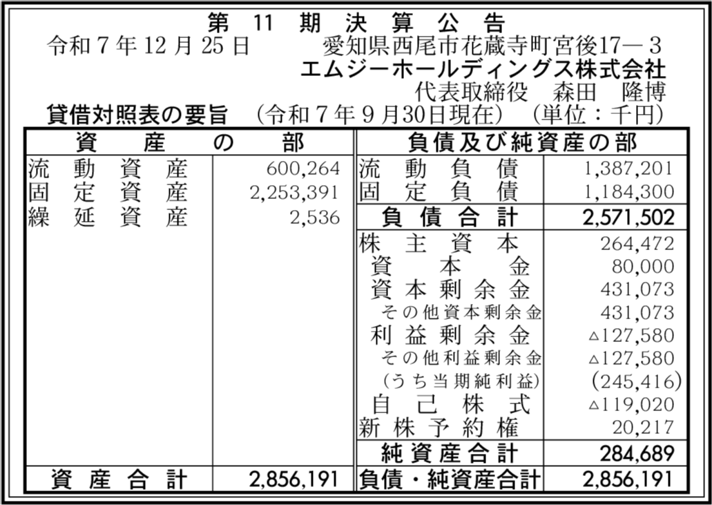 | 総資産 | 28億5,619万1,000円 (+25.33%) |