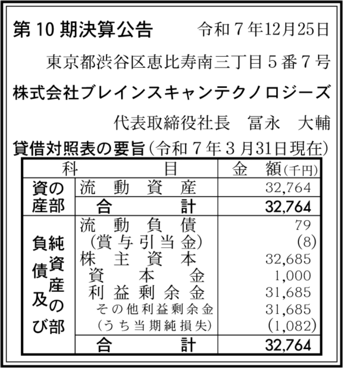 | 会社名 | 株式会社ブレインスキャンテクノロジーズ |