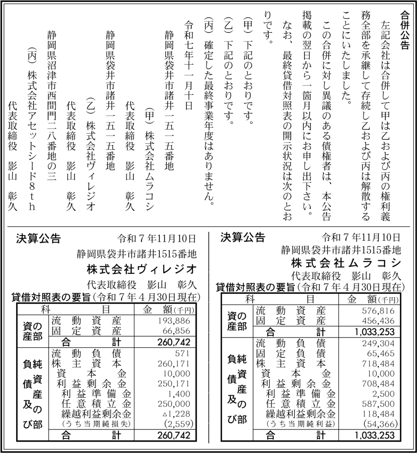 株式会社ヴィレジオ 静岡県袋井市 【2025年4月期】 |