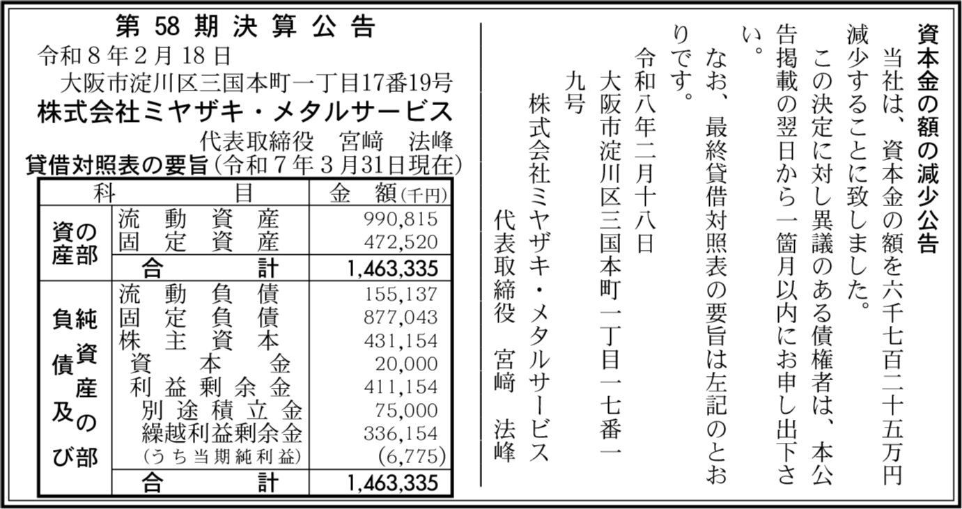 | 会社名 | 株式会社ミヤザキ・メタルサービス |