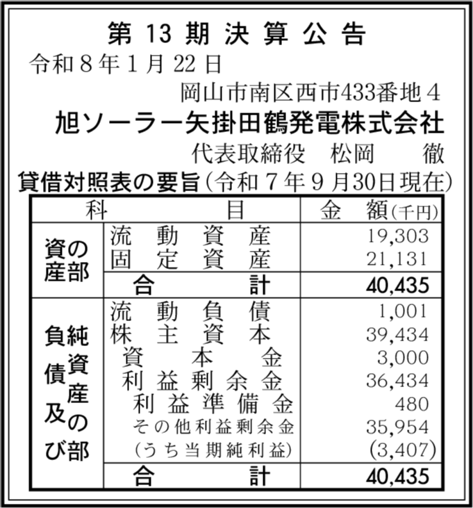 旭ソーラー美作北山発電株式会社 岡山市南区 【2025年9月期】 |