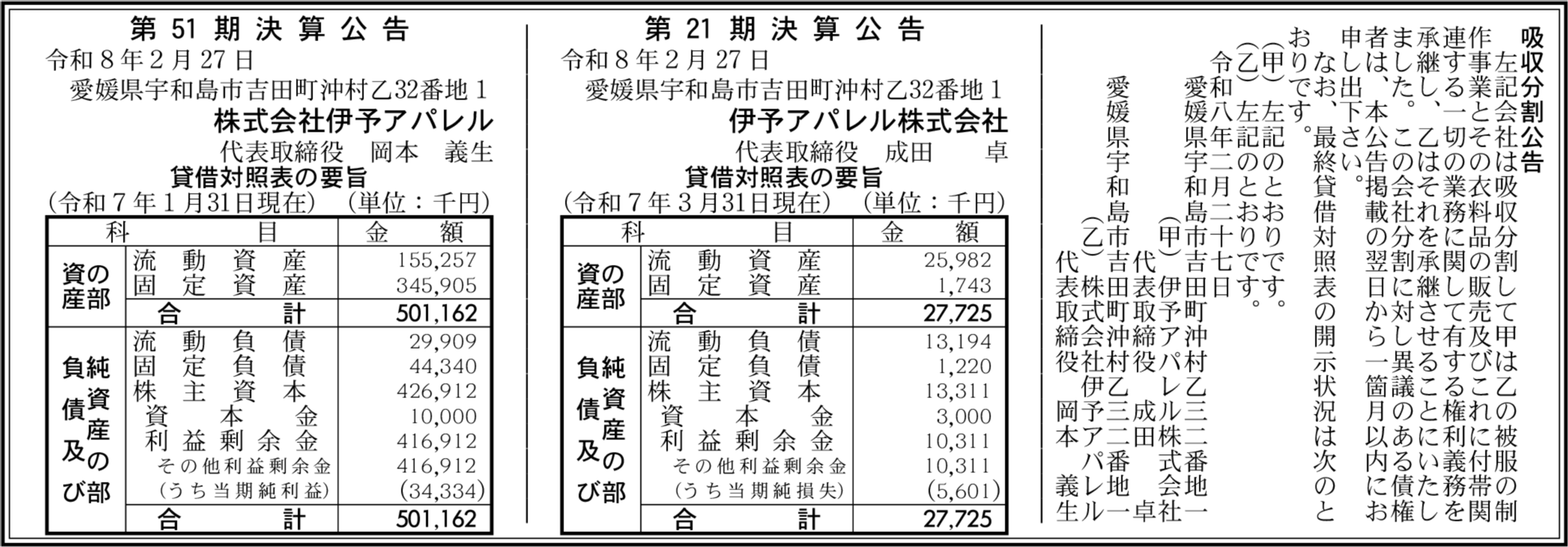 伊予アパレル株式会社 愛媛県宇和島市 【2025年3月期】 |