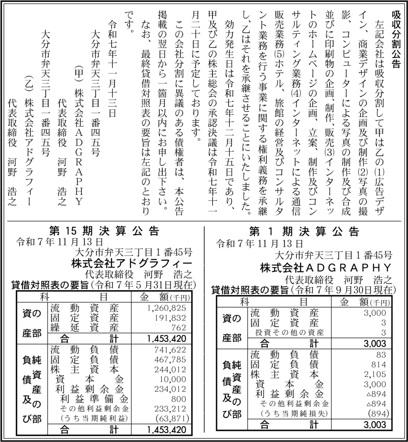 株式会社GLAD ORIGIN 大分県大分市大字下郡1716番地の6 アドバンス21岩田町 【2025年7月期】 |