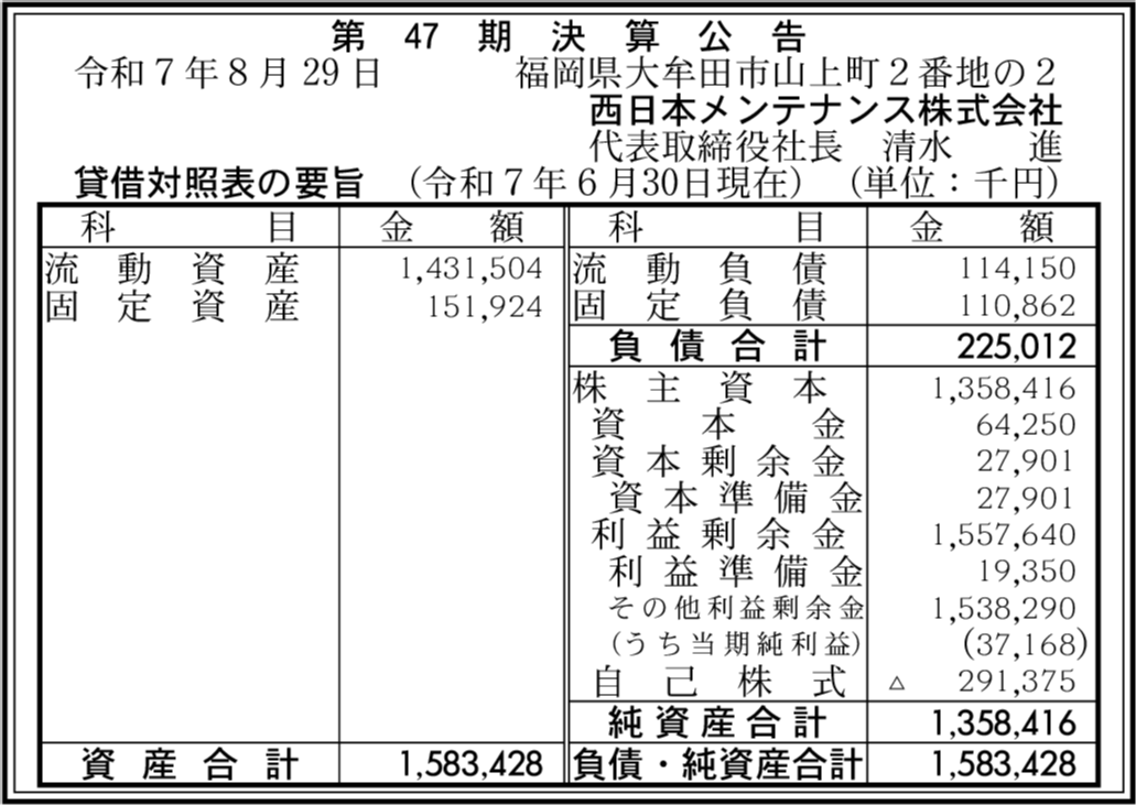 純資産 | 13億5,841万6,000円 (+2.45%) |
