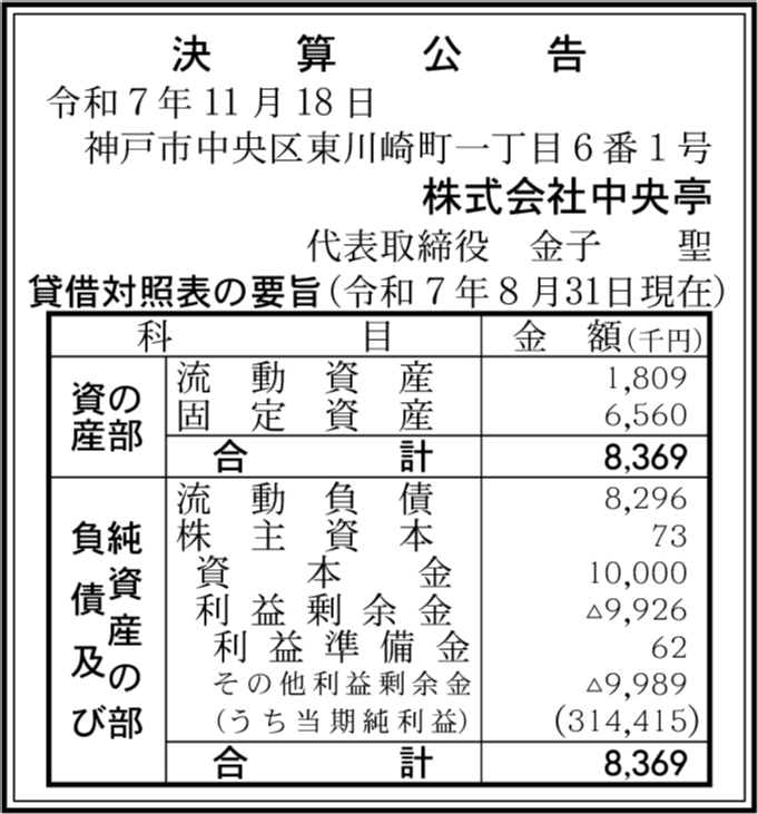 | 会社名 | 株式会社中央亭 |