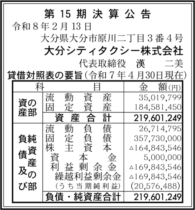 南大分シティタクシー株式会社 大分県大分市 【2025年8月期】 |