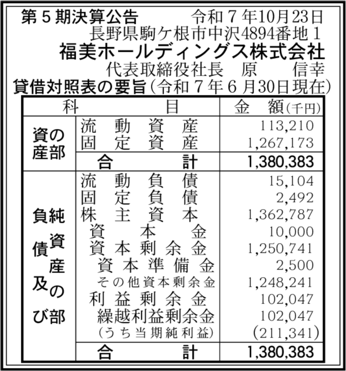 | 福美建設株式会社 長野県駒ヶ根市 【2025年6月期】 | 4,883万円 (▲77.76%) | 13億639万3,000円 (▲10.76%) | 16億5,955万7,000円 (▲11.9%) |