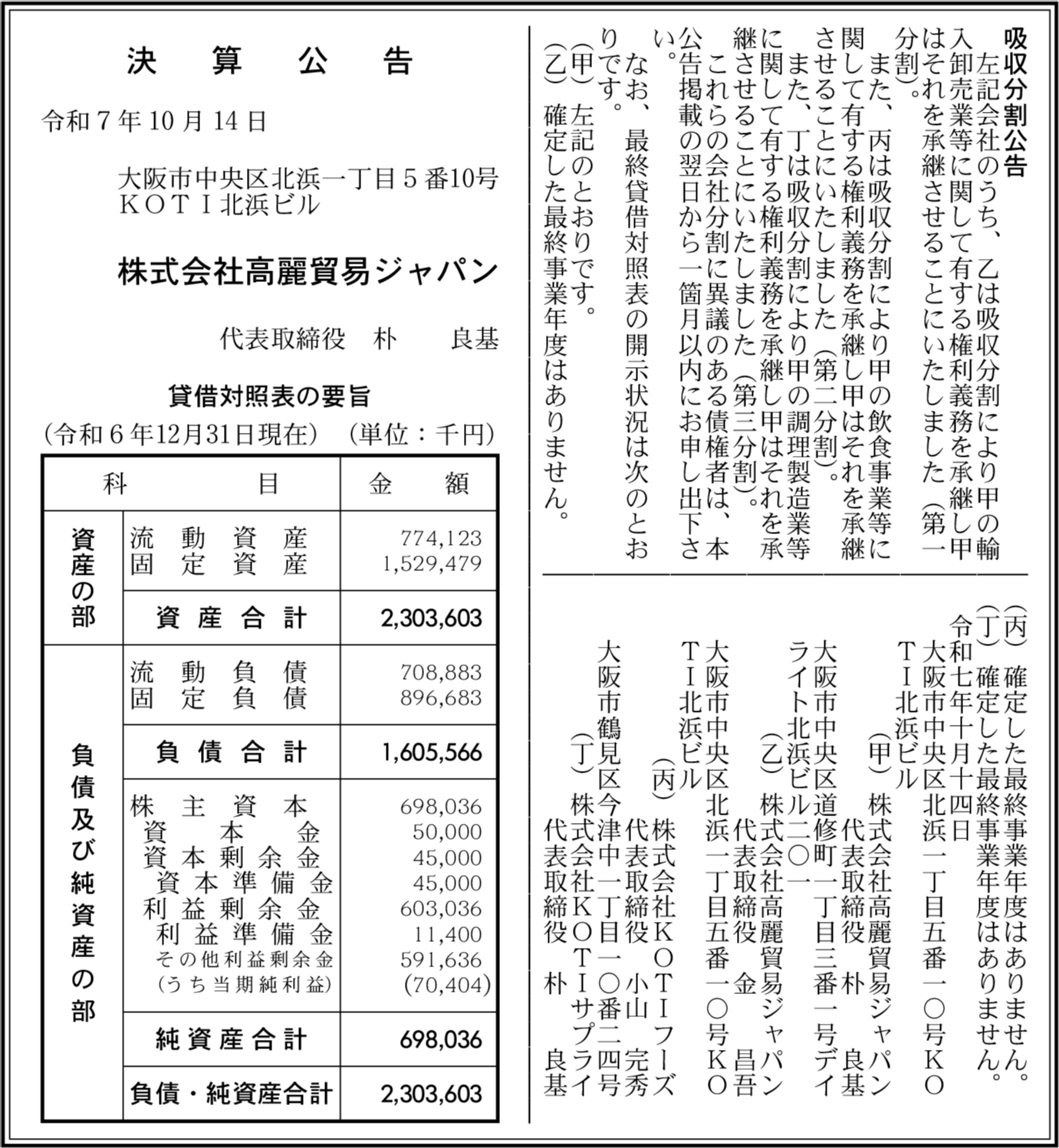 株式会社KG F&B JAPAN 大阪市中央区 【2024年12月期】 |