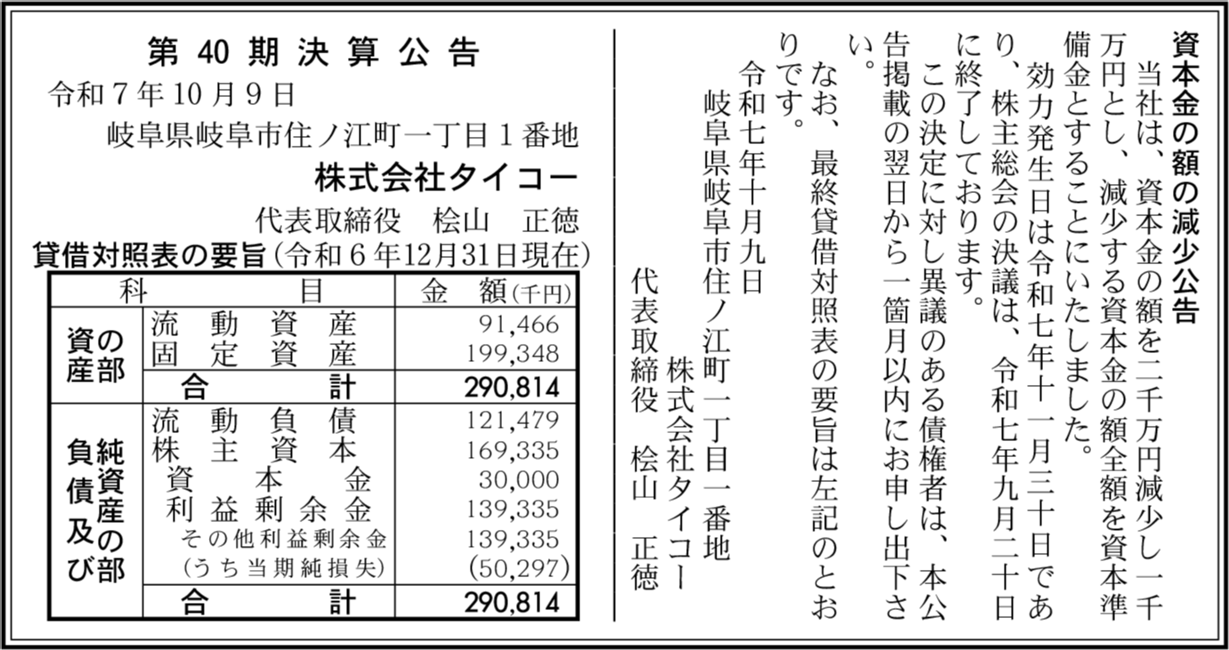 会社名 | 株式会社タイコー |