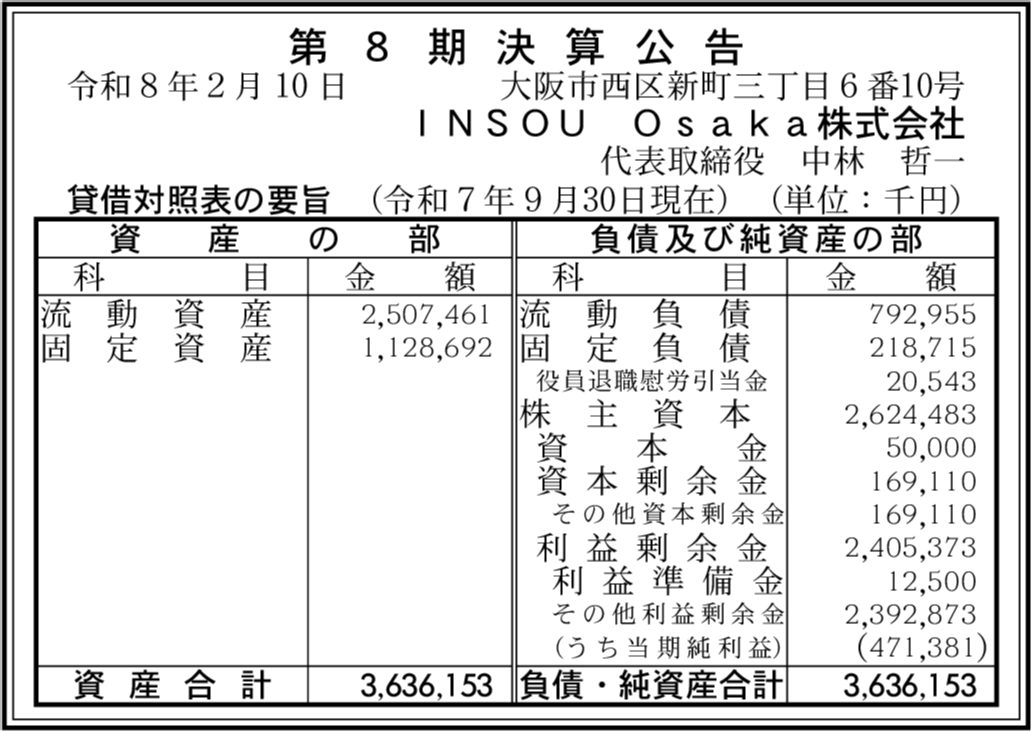 INSOU CENTRAL株式会社 大阪市西区 【2025年9月期】 |