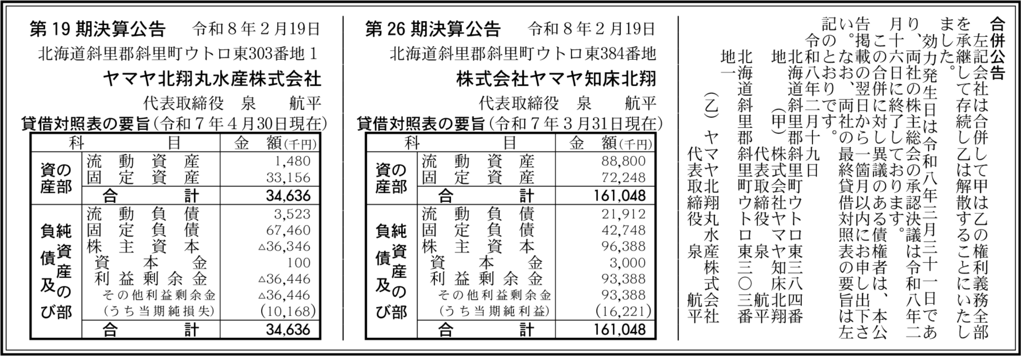 ヤマヤ北翔丸水産株式会社 北海道斜里郡斜里町 【2025年4月期】 |