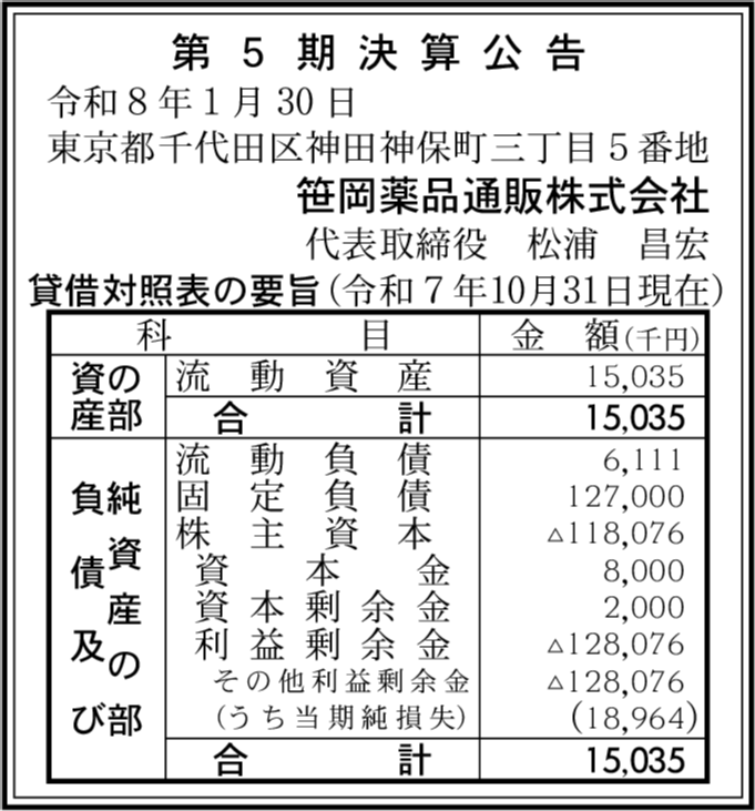 | 利益剰余金 | ▲1億2,807万6,000円 (赤字拡大) |