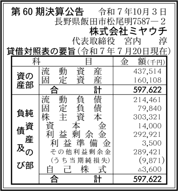 株式会社ミヤウチ 長野県伊那市 【2025年7月期】 |