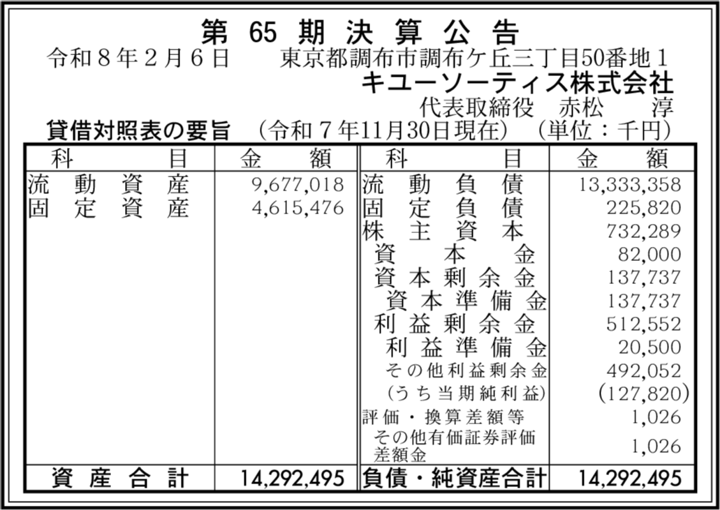 キユーソーサービス株式会社 東京都調布市 【2025年11月期】 |