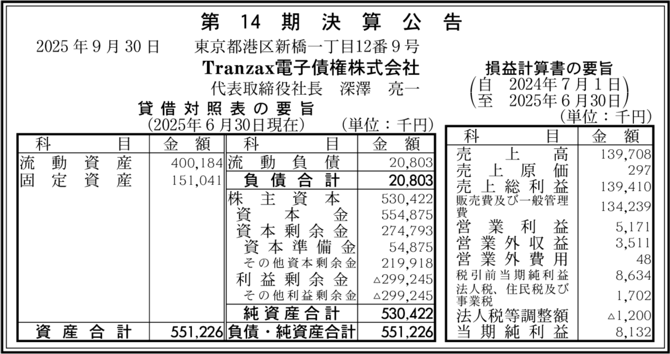 Tranzax電子債権株式会社 東京都港区 【2024年6月期】 |