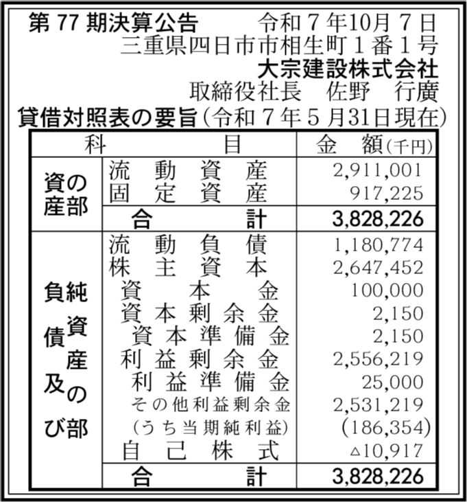 大宗建築サービス株式会社 三重県四日市市 【2025年5月期】 |