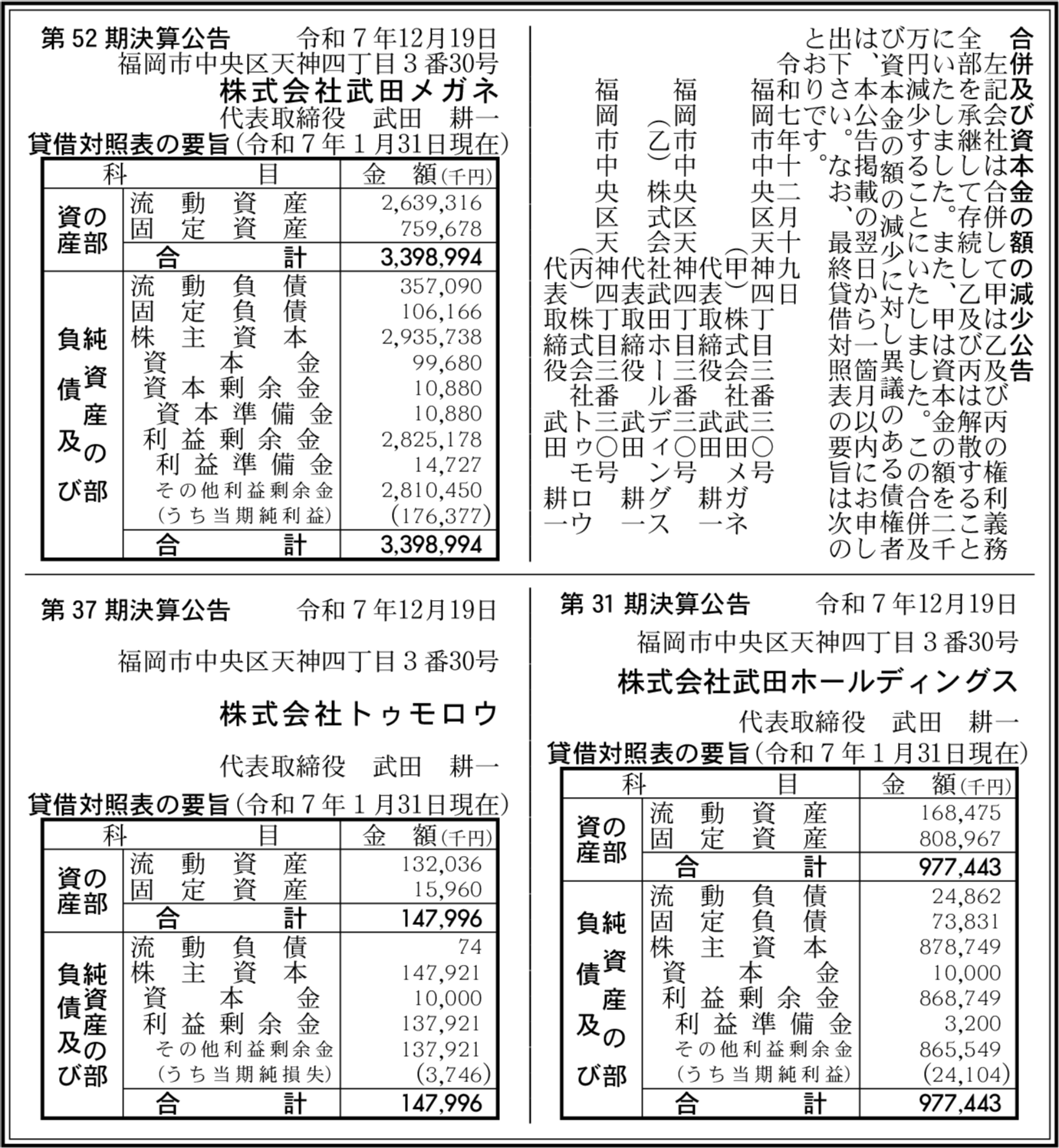 株式会社武田ホールディングス 福岡市中央区 【2025年1月期】 |