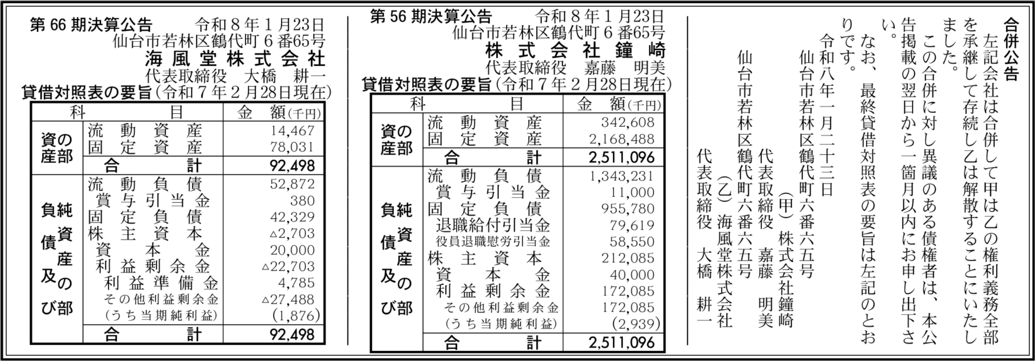 海風堂株式会社 仙台市若林区 【2025年2月期】 |