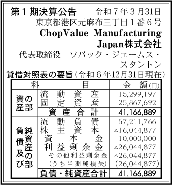 | 会社名 | ChopValue Manufacturing Japan株式会社 |