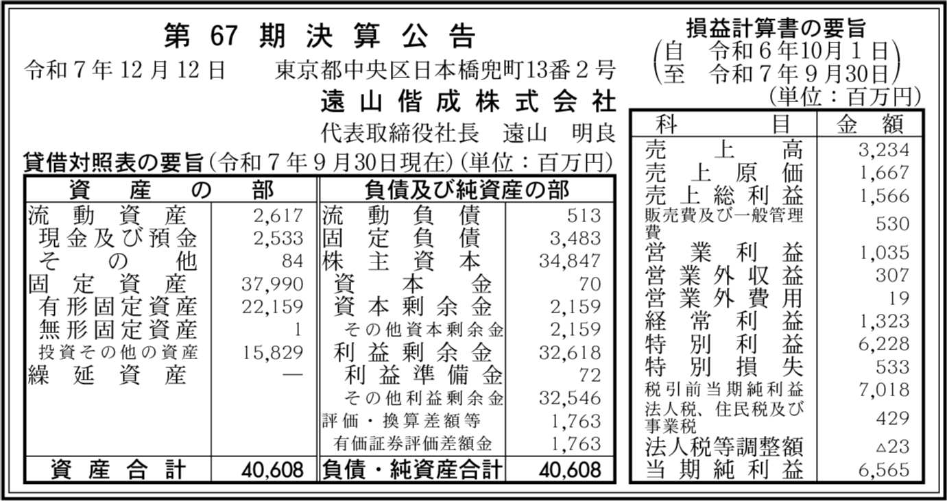 遠山偕成ホールディングス株式会社 東京都中央区 【2024年9月期】 |