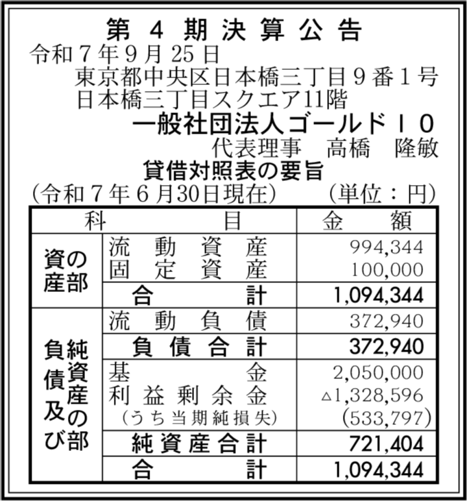 一般社団法人ゴールドI 東京都中央区 【2025年6月期】 |