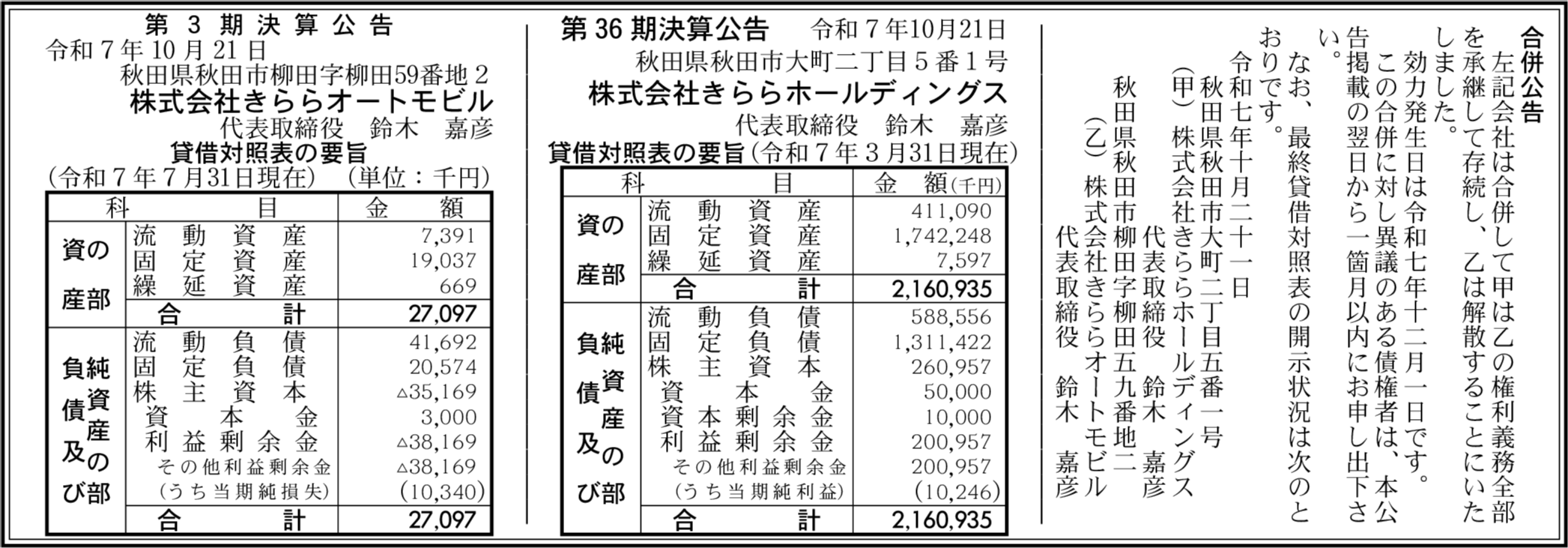 株式会社きららホールディングス 秋田県秋田市 【2025年3月期】 |