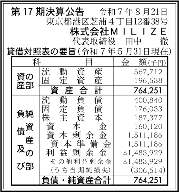 | 利益剰余金 | △14億8,392万9,000円 (赤字拡大) |