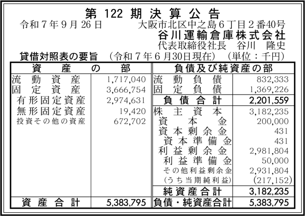 瀬戸谷川倉庫株式会社 大阪市北区 【2025年6月期】 |