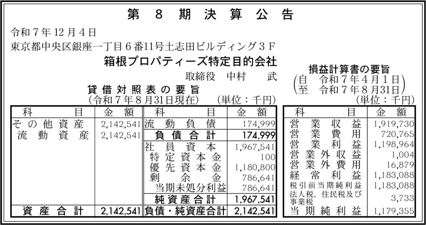 | 会社名 | 箱根プロパティーズ特定目的会社 |