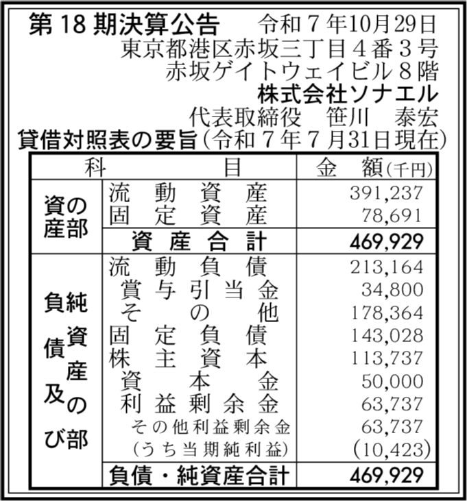 | 利益剰余金 | 6,373万7,000円 (▲14.05%) |