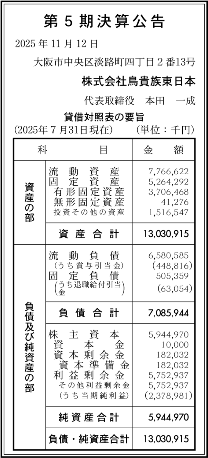 株式会社鳥貴族西日本 大阪市中央区 【2025年7月期】 |