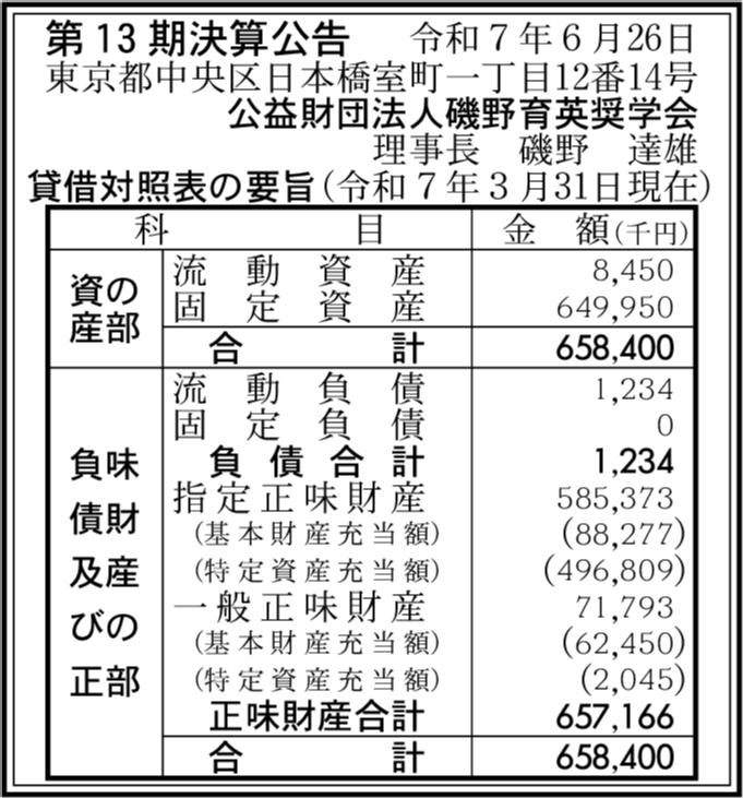 | 会社名 | 公益財団法人磯野育英奨学会 |