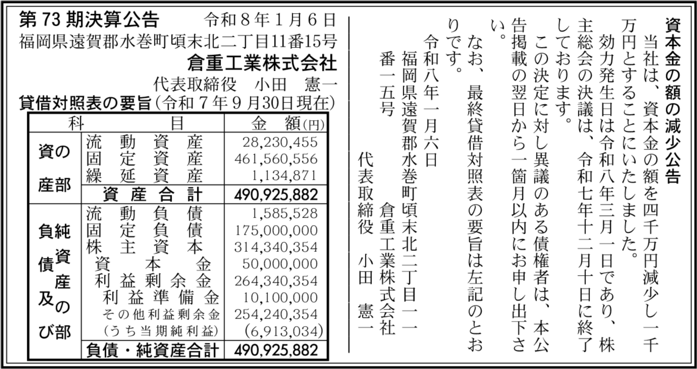 | 会社名 | 倉重工業株式会社 |