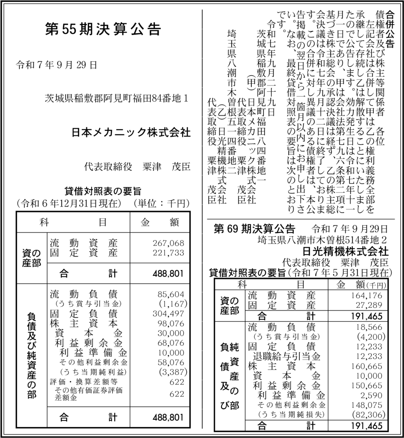 日本メカニック株式会社 茨城県稲敷郡阿見町 【2024年12月期】 |