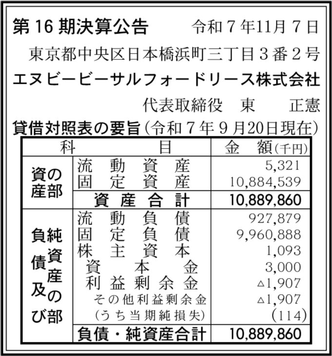 エヌビービーラッフルズプレイスリース株式会社 東京都中央区 【2025年9月期】 |