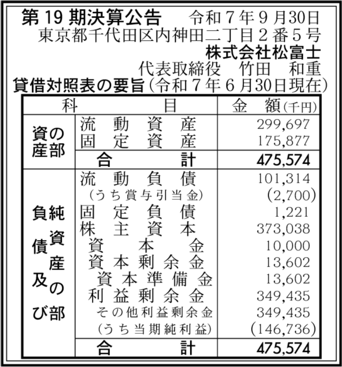 | 利益剰余金 | 3億4,943万5,000円 (+72.39%) |