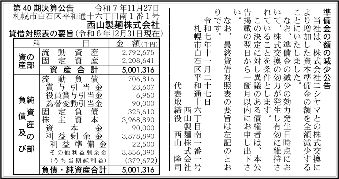 西山食品株式会社 札幌市白石区 【2020年12月期】 |
